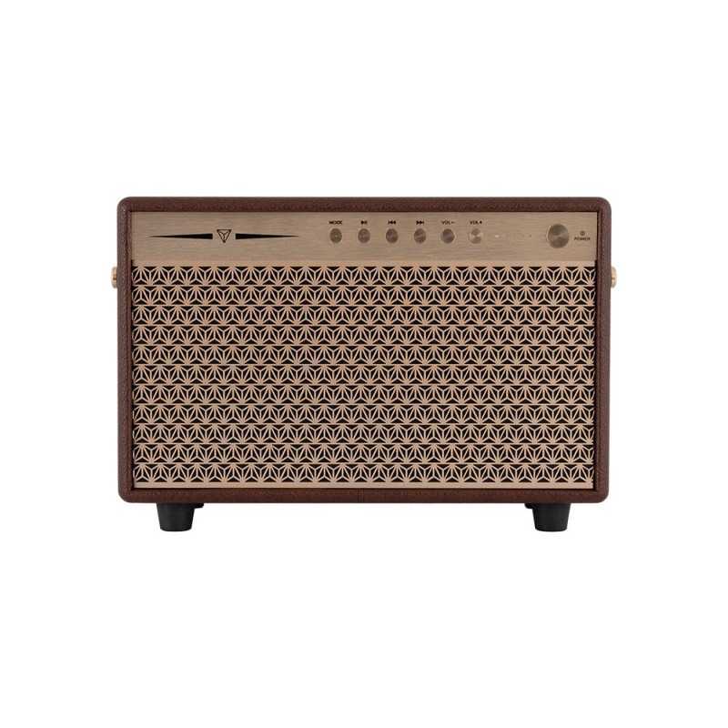 The natural and well-balanced sound image comes from the rigid midrange paper cone woofer that thanks to a special coating can perform at low and high volumes, and the silk dome tweeter with a high-quality neodymium magnet that ensures a crisp ant highly detailed sound. To make sure that the bass is powerful and precise the cabinet is made out of MDF and equipped with a reflex port, together with the acoustic feet these features minimize effect loss to vibrations and allows the woofer to perform to the fullest. The control panel and the custom Dynavoice grille are copper coloured, made out of anodised aluminium making them extra resilient, and the included strap makes the speaker easy to carry.